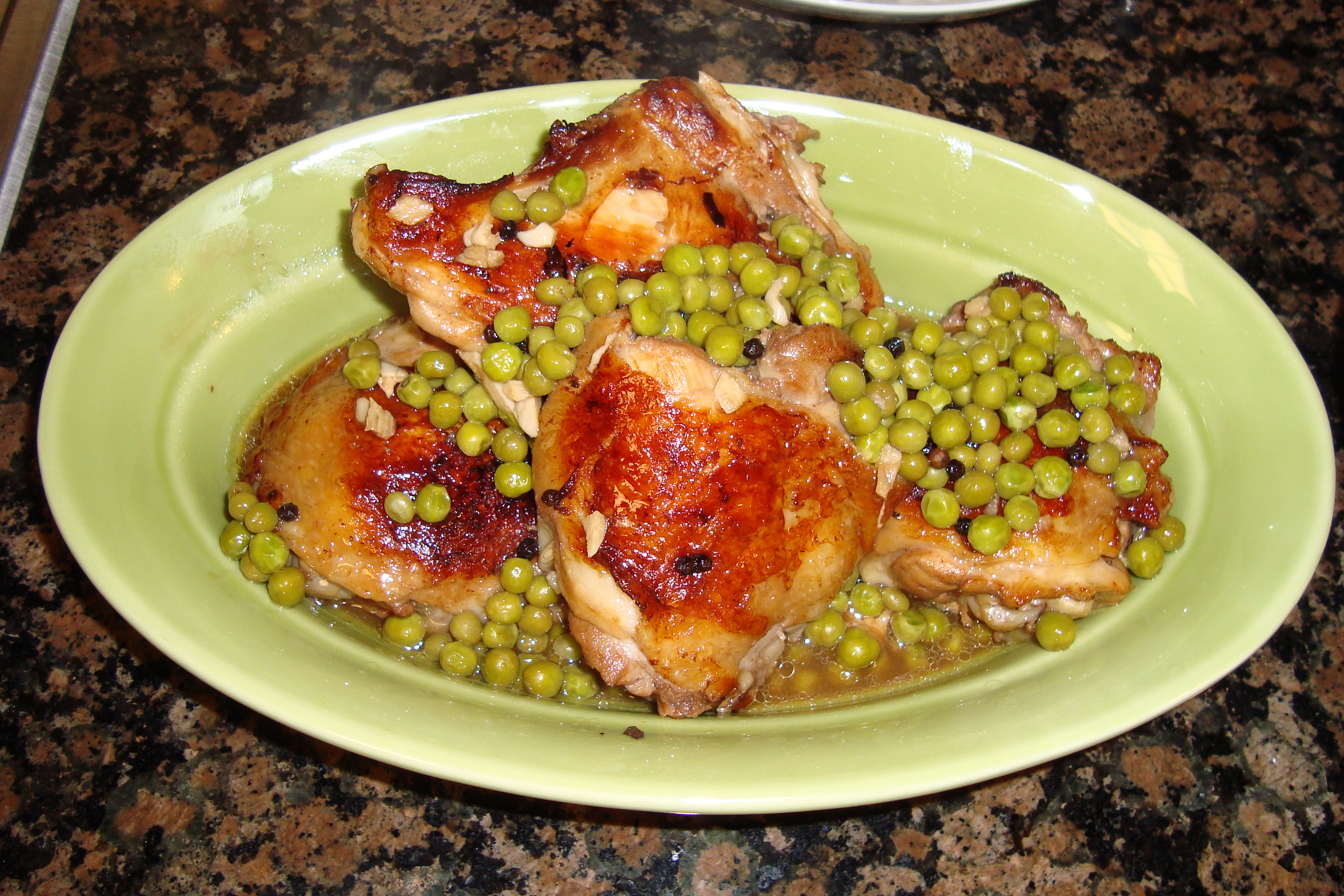 Adobo is also commonly made with pork, which I somehow have yet to try! Next time I have some extra pork butt (this happens more than you might think, since we buy the Costco packs), I think I will give it a shot. Tonight, the bacon in the peas will have to satisfy our pork, craving.