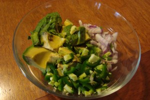 Combine the avocado, onion, cilantro, and jalapeno in a bowl. Season with salt and pepper, then add the lime juice.
