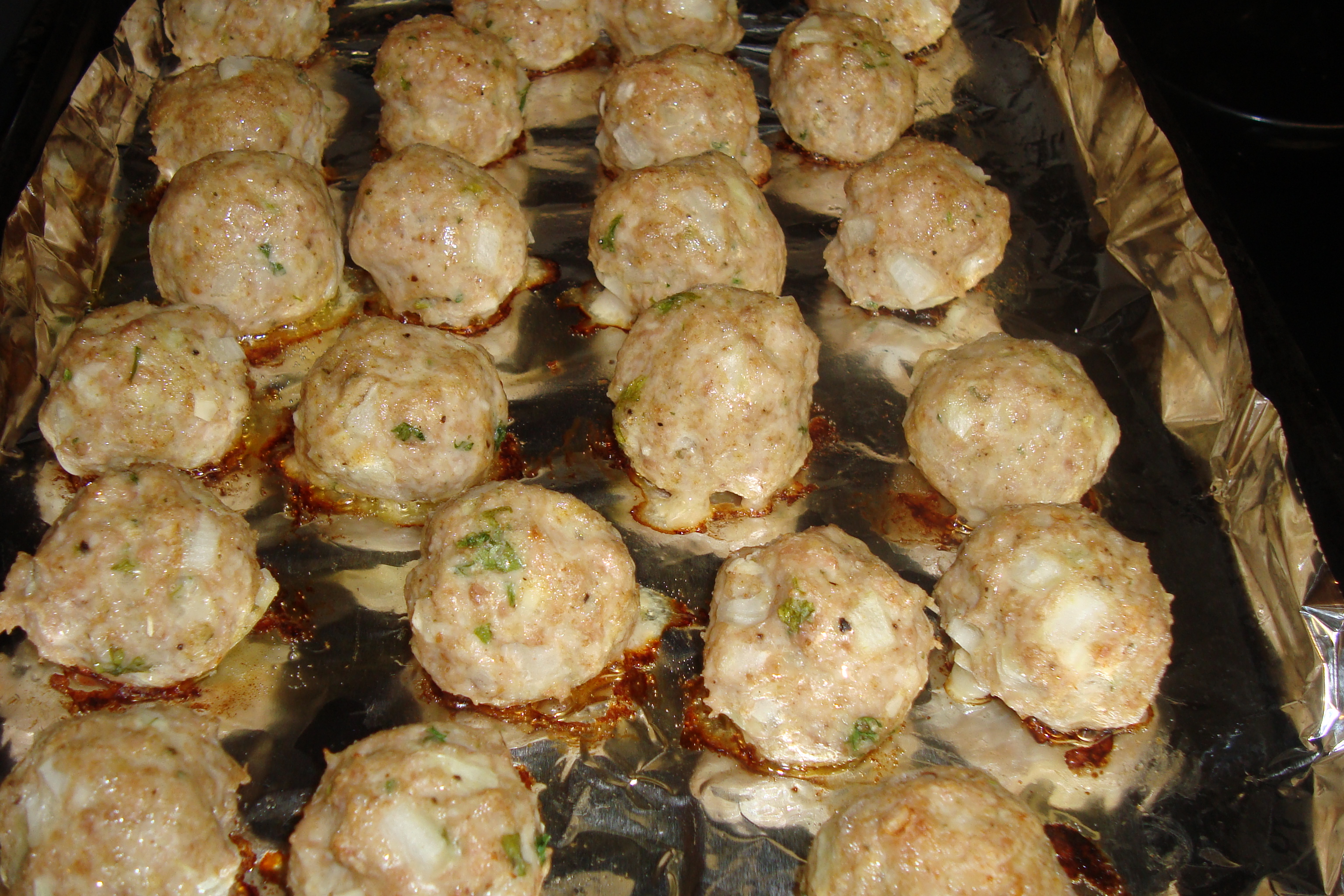 To make the meatballs, combine all of the ingredients except for the olive oil in a mixing bowl. Mix together with your hands (don’t over-combine though, it will make them tough). Drizzle the olive oil onto a baking sheet, then roll the balls into one-inch balls. Place the balls on the baking sheet and roll around in the oil. Bake for 20 minutes.