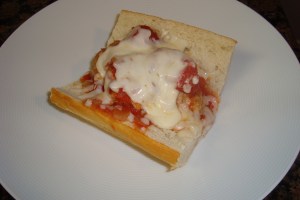 To assemble the sandwiches, slice the baguette into 4-inch pieces. Cut long-ways, but not all the way through. Arrange meatballs and sauce on the bread.