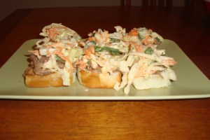 I have posted about my love of pulled pork and how to make it in the slow cooker before, but this time I decided to try The Pioneer Woman’s Spicy Dr. Pepper Shredded Pork. I served it with my go-to cole slaw on the mini sweet Hawaiian rolls. I took this picture before I put the tops on so that you would be able to see the filling.
