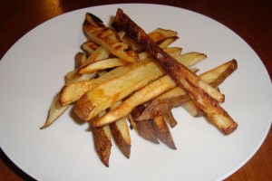 The problem with baking french fries is that they never get crispy enough. When I saw Melissa d’Arabian make them on her show, she added a little bit of sugar to help them brown. I also pre-soaked the fries in ice water to remove some of the extra starch. The end result was crispy and quite delicious.