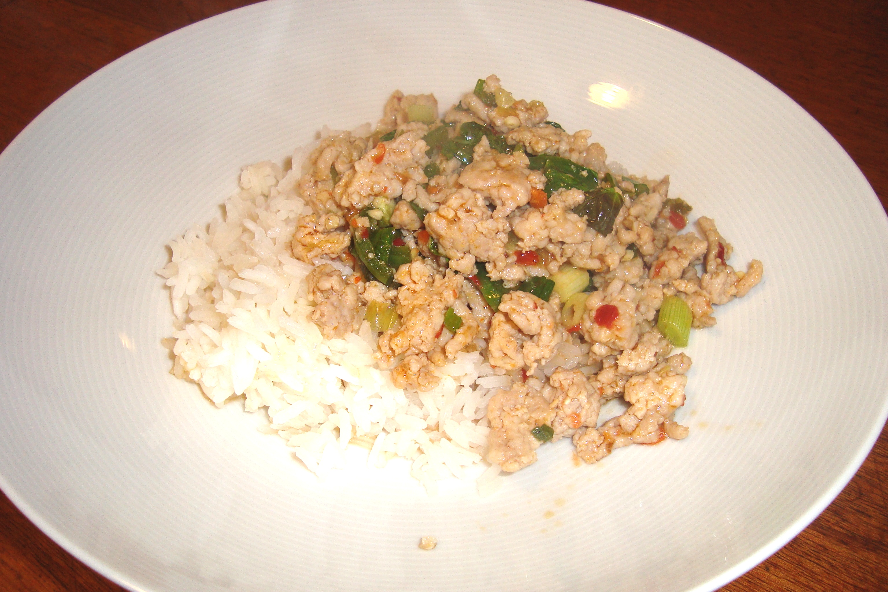 I was introduced to a Thai dish recently, by my (Thai) friend Kathy, and now I am obsessed with it. It’s ground chicken stir-fried with mint and chilies. It’s so simple but so good, and such a nice change from the old stand-bys pad thai, panang curry, etc. I decided to make a dish inspired by that using basil instead of mint. My version was a tiny bit salty, so I recommend starting with less fish sauce and adding more after tasting it.