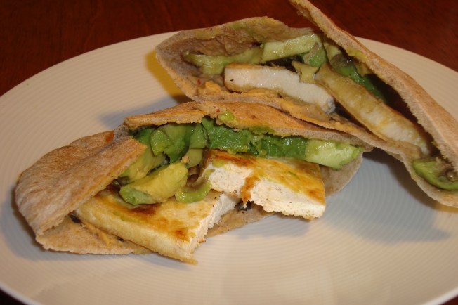 Cut the pieces of pita bread in half, so that you can access the pockets. Toast very lightly. To build the sandwiches, spread hummus on one side of the pita pocket, then add the tofu and avocado. I added pickles to my sandwich as well, so if you like pickles, give it a shot!