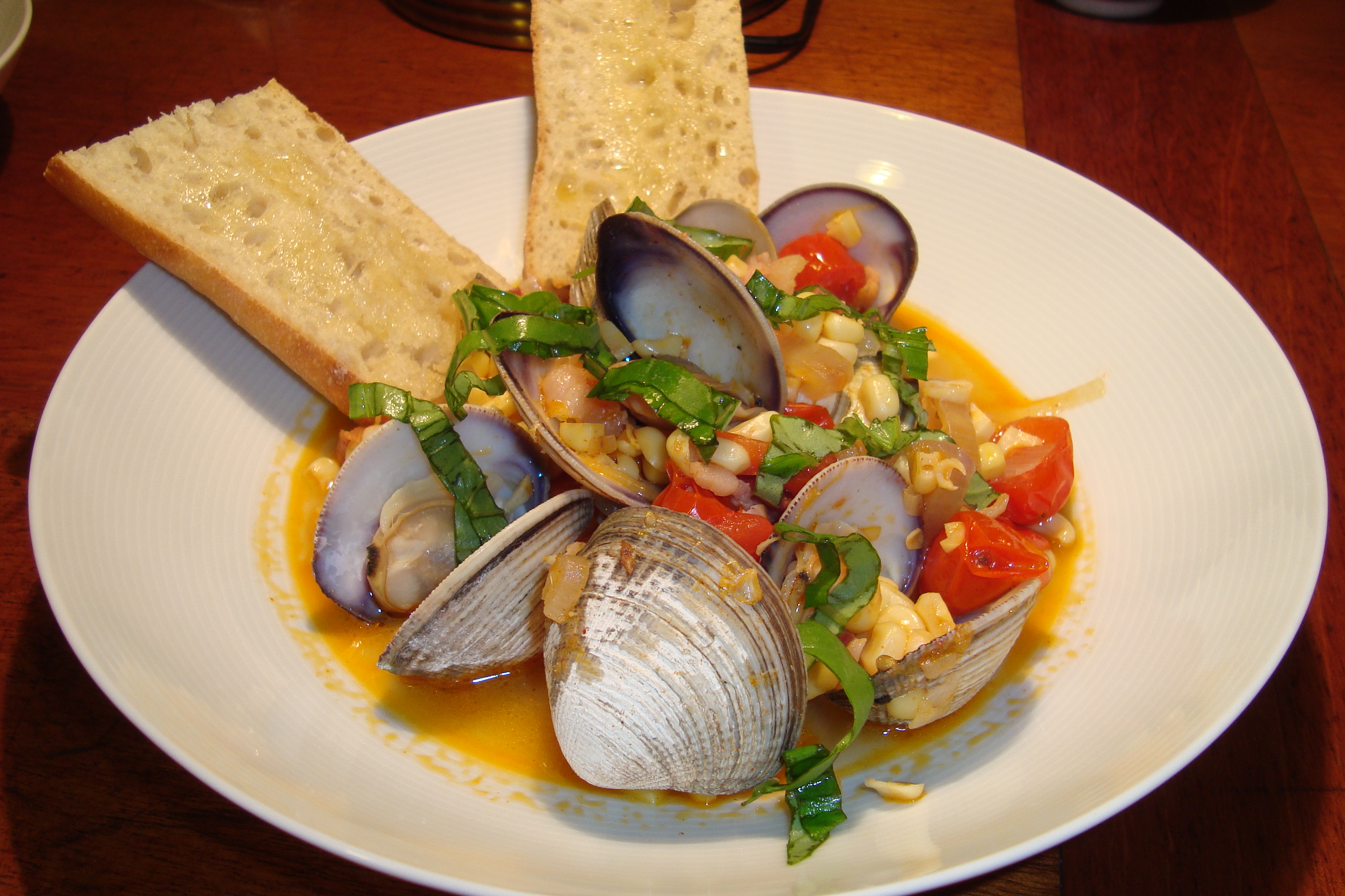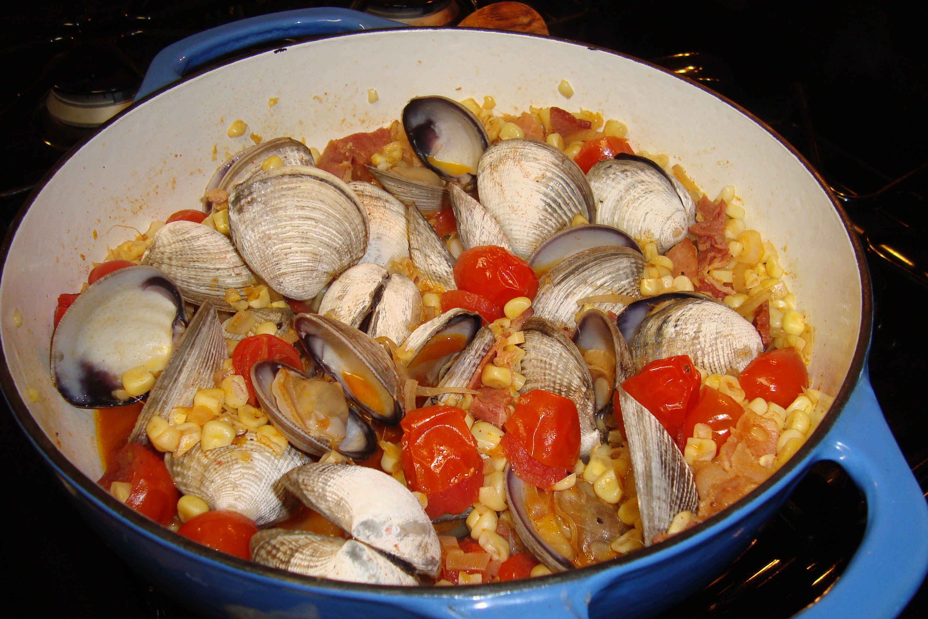 Clams with Bacon, Corn, and Cherry Tomatoes