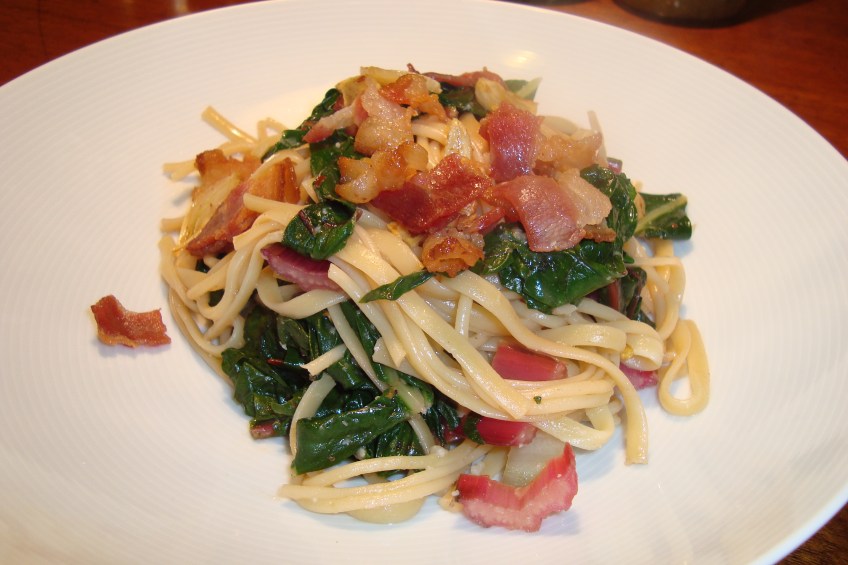 DSC02290 Published December 15, 2012 at 3072 × 2048 in Spaghetti with Swiss Chard, Bacon, and Garlic Chips