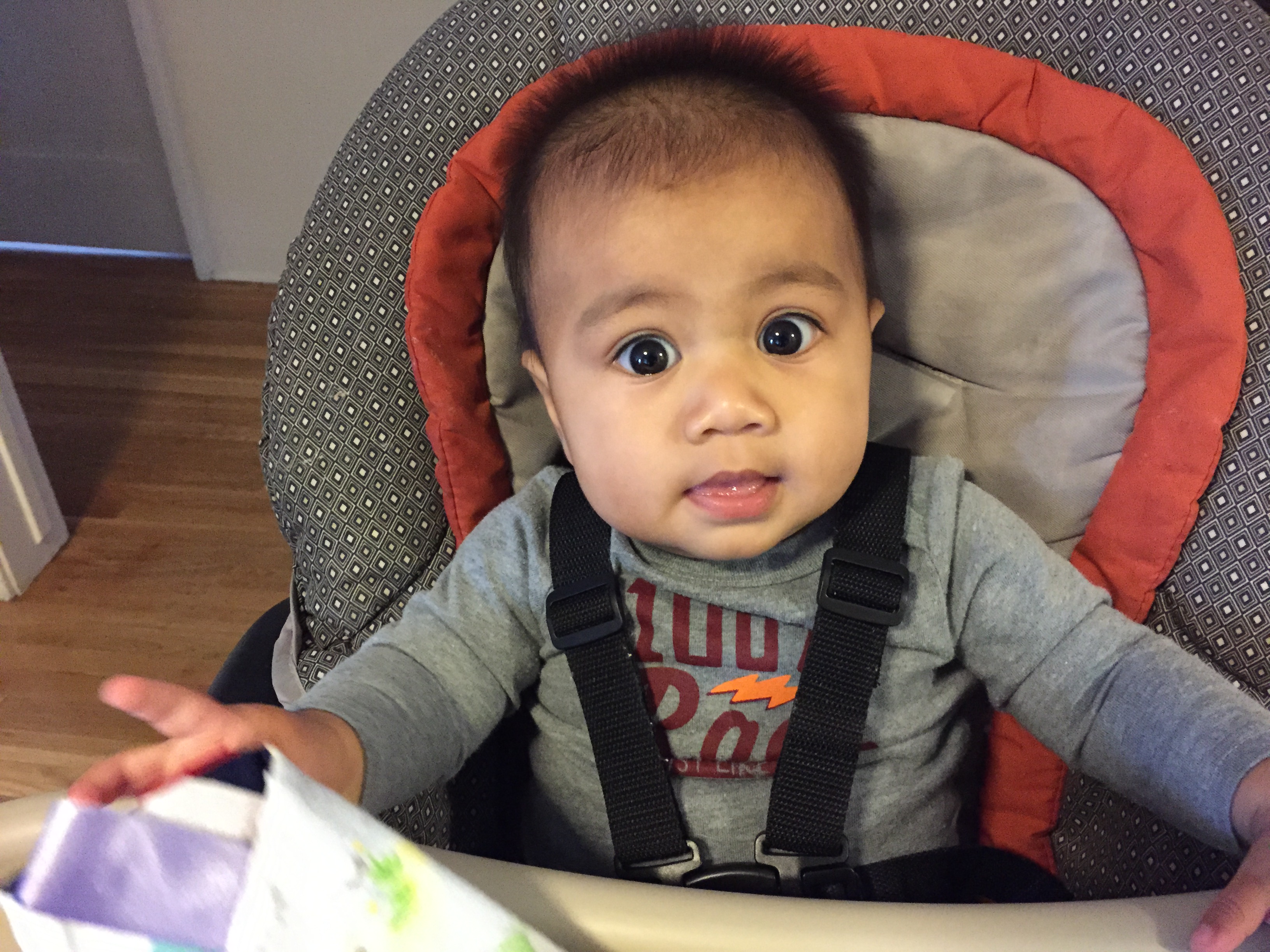 His first tooth appeared on his 7-month birthday, which also happened to be Mother’s Day. It was a Mother’s Day miracle!  He can sit up on his own and is getting pretty good at scooting around.