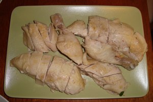 Marinate the chicken breasts in sesame oil and soy sauce for 15-30 minutes. Heat the grill or a grill pan to medium high, then grill on each side for about 8 minutes, or until cooked through. Cool, then slice into bite-sized pieces.