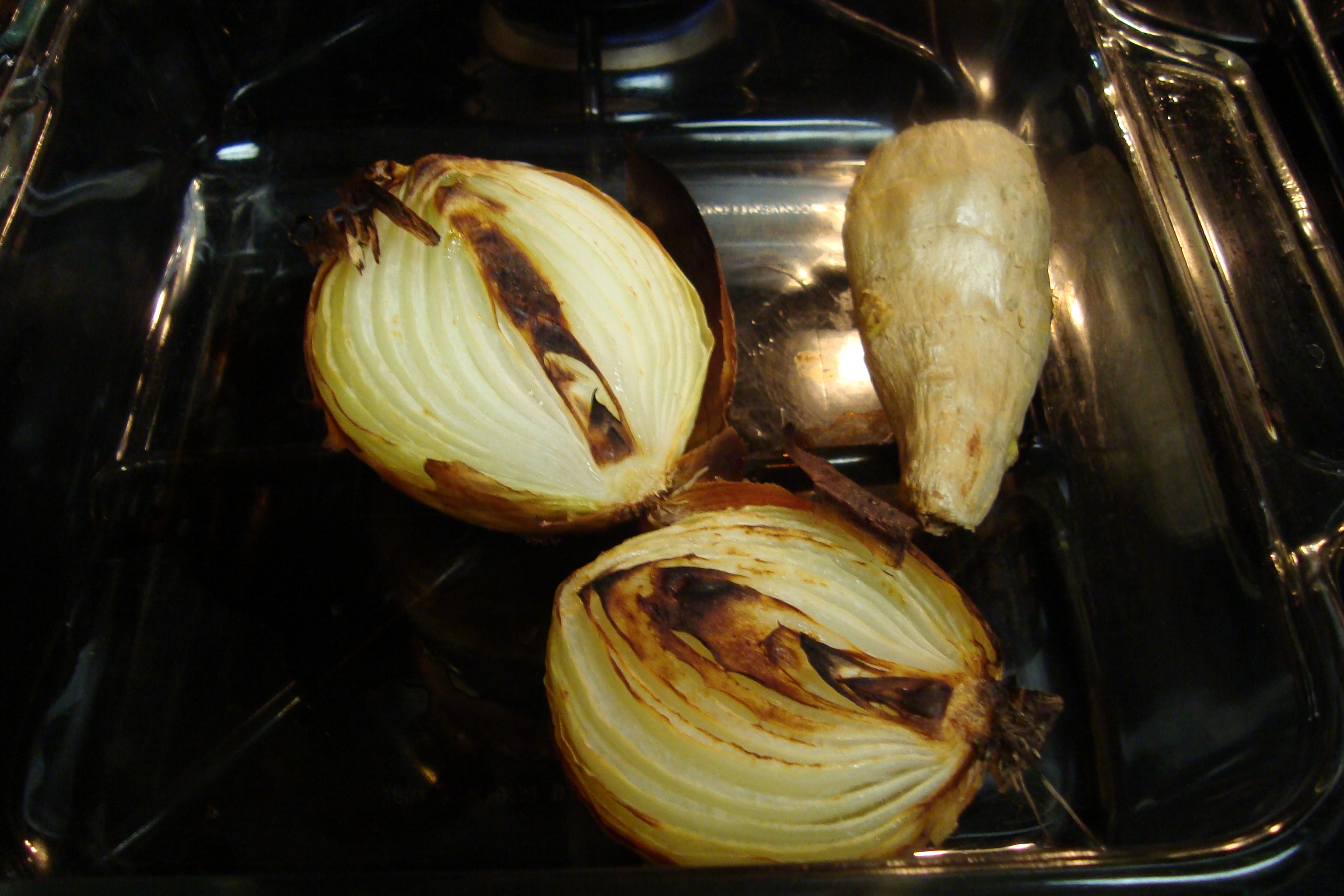 Begin by preheating your broiler to high. Put the onion halves and ginger on a baking tray on the top shelf, and broil for 15 minutes, turning at the halfway point. The onion skin will brown and both the onion and the ginger will soften. When they are done, remove the skin from the onion and ginger, and slice the ginger into thick slices.