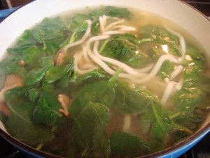 Heat the chicken broth over high heat. When the water is simmering, add the mushrooms (including the water they’ve been soaking in), spinach, and udon noodles. Allow to simmer for a couple of minutes, then stir in the miso paste.