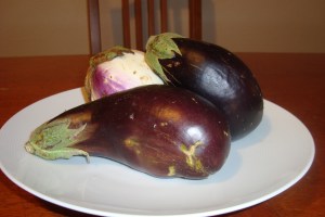 I bought these cute little eggplants at the farmers market, but one big one would be just fine. I always leave the skin on, but you can peel it if the texture bothers you.
