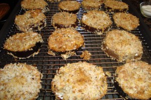3. Set up a little assembly line, and coat the eggplant slices first in flour, then egg, then a mixture of panko and grated parmesan/romano cheese.