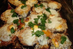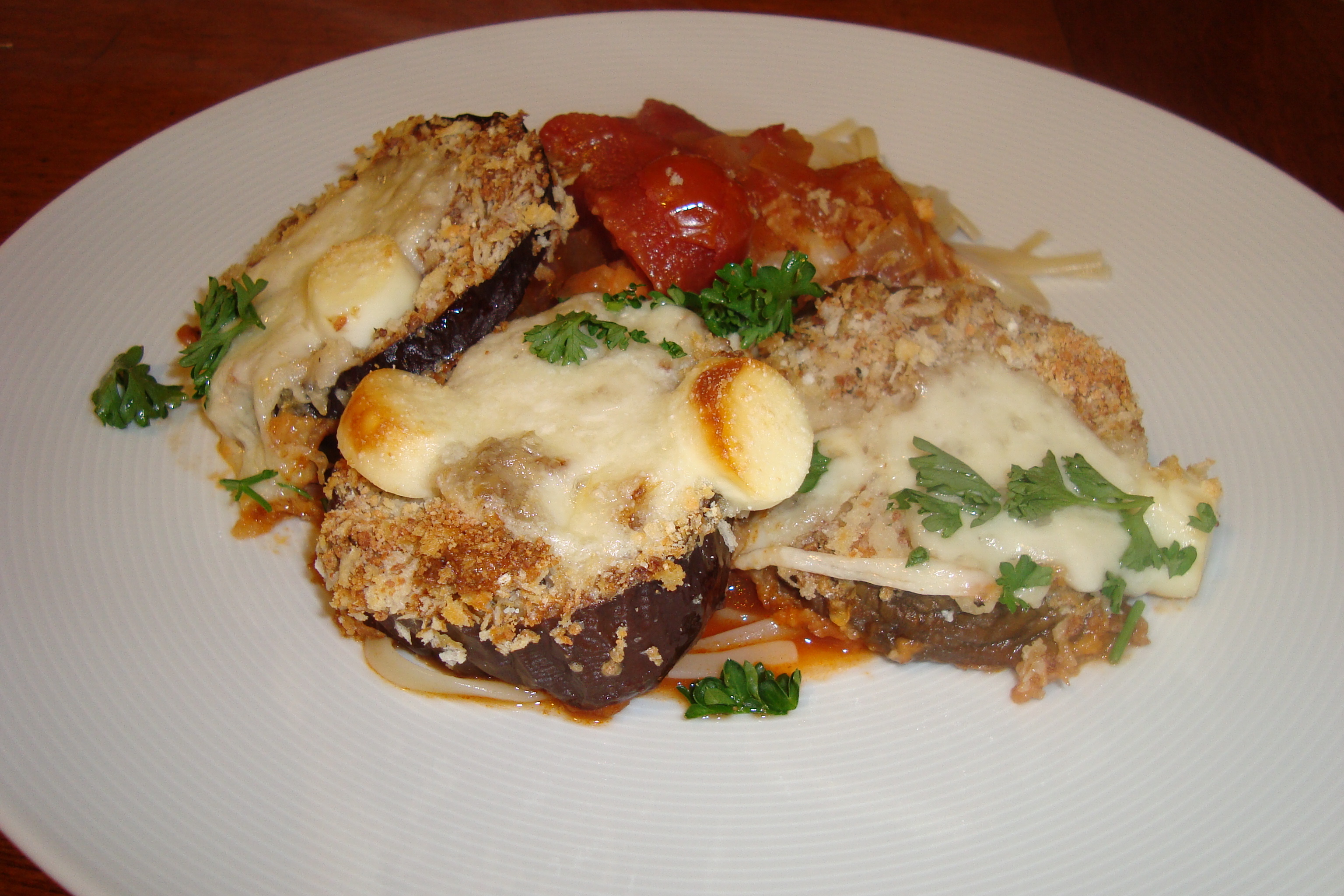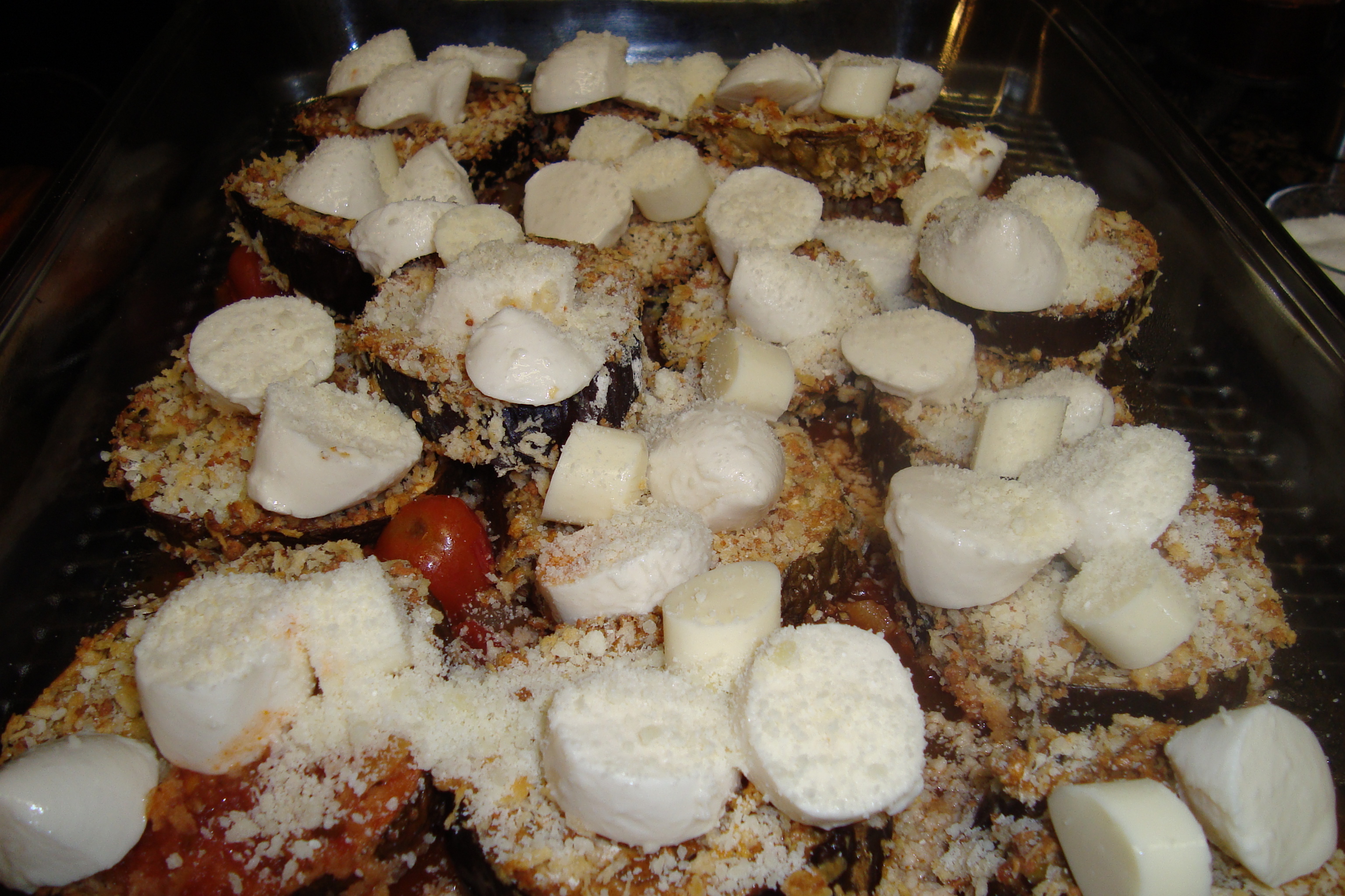 2. I like the eggplant to stay crispy, so I only use a little bit of sauce and then serve it with extra sauce over the pasta. Spread a little bit of sauce in the bottom of a large casserole dish, then lay the pieces of eggplant on top of the sauce, and cover the eggplant with the mozzarella and parmesan.