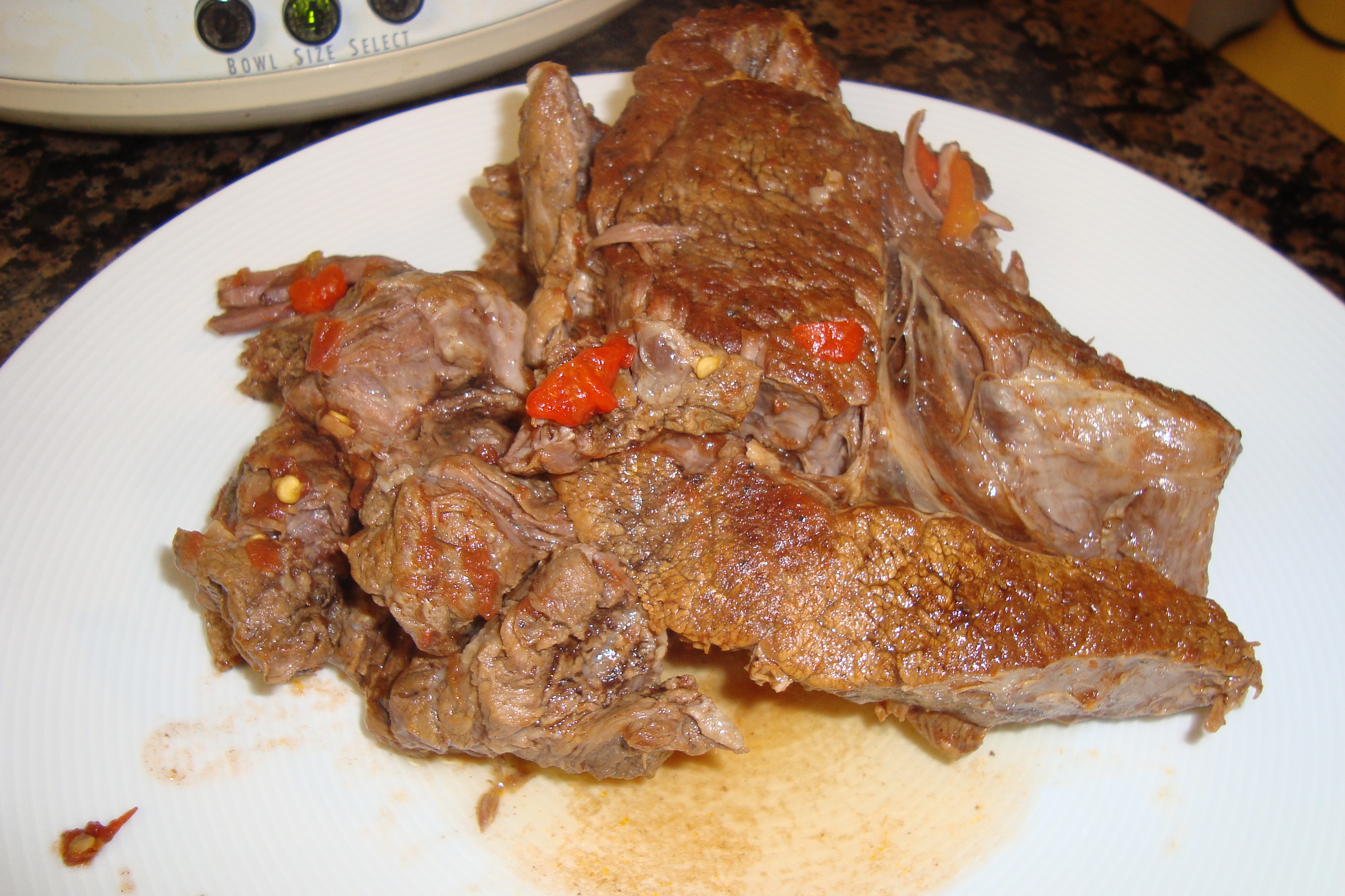 Place the garlic, tomatoes, stock, peppers, pimientos, and seared beef into a slow-cooker. Cook on the high setting for 4-5 hours (or low for 8-10 hours).