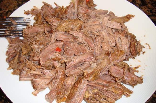 Pull the meat apart with forks or tongs, then place it back into the liquid.