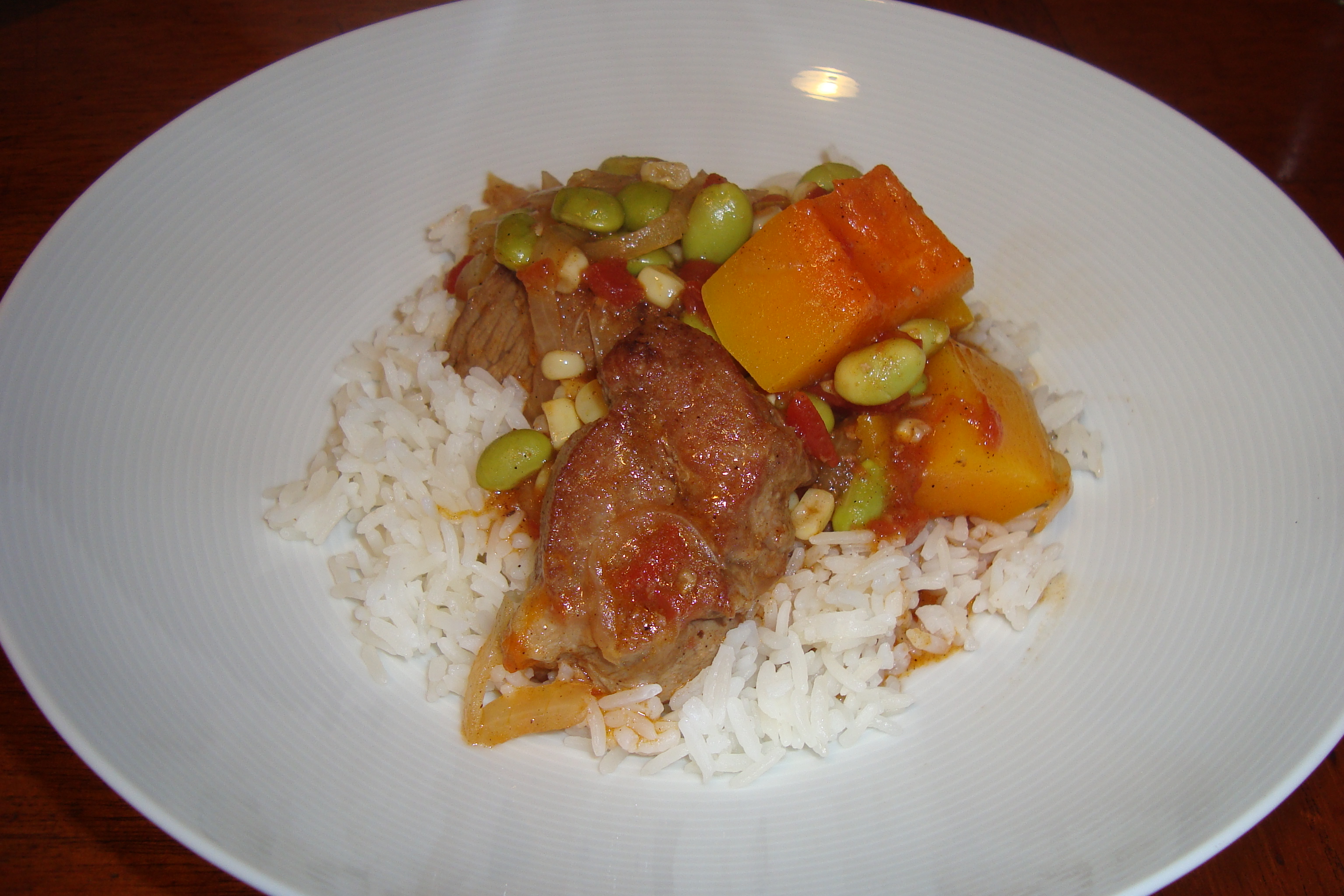 Place the garlic, tomatoes, stock, peppers, pimientos, and seared beef into a slow-cooker. Cook on the high setting for 4-5 hours (or low for 8-10 hours).